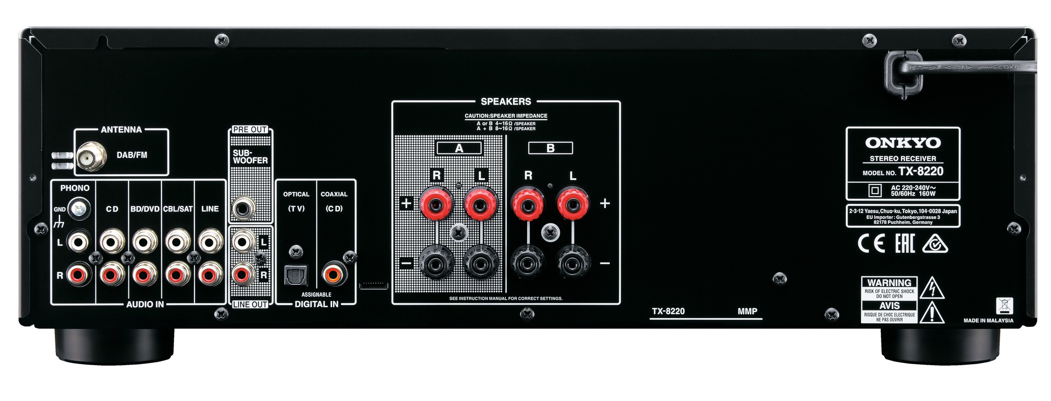 TX-8220 оснащен двумя парами колоночных клемм, что позволяет подключить две пары акустических систем. Конструкция ресивера позволяет работать либо с одной парой колонок с импедансом от 4 Ом до 16 Ом, либо с двумя парами, но с импедансом от 8 Ом до 16 Ом. Таким образом, вы можете наслаждаться звучанием одного и того же источника в двух комнатах одновременно, или легко переключать пары колонок, оставляя музыку в одной из комнат.