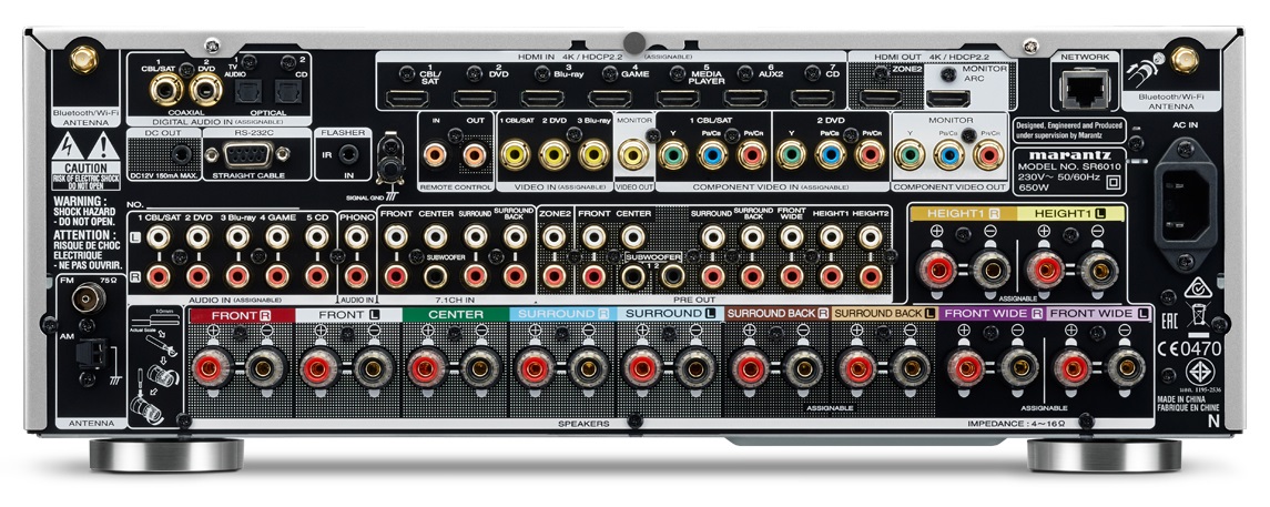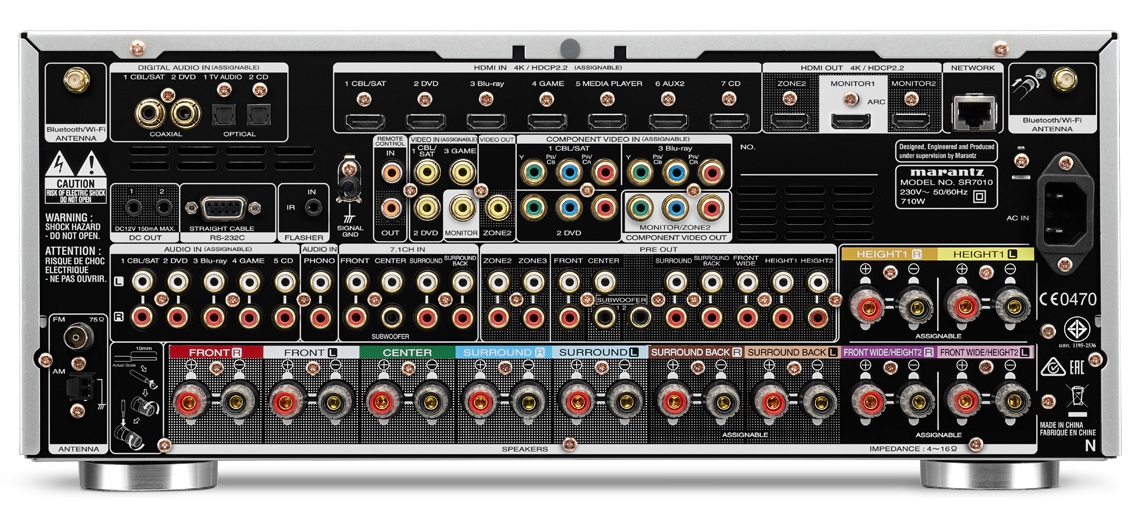 Ресивер Marantz SR 7010 имеет 9 каналов усиления, что позволяет сделать полноценную систему 5.1.4 или 7.1.2 без добавления внешнего усилителя мощности, но добавив его, можно получить самую совершенную на сегодняшний день конфигурацию 7.1.4, где будут присутствовать 2 фронтальные АС, центральный канал и сабвуфер, 2 боковые АС, 2 тыловые и 4 потолочные, что максимально усилит эффект присутствия при просмотре самых динамичных кинопроизведений.