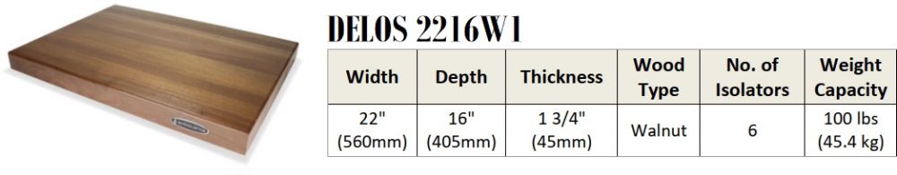 Виброизолирующая платформа, массив грецкого ореха, 560x405x45 мм, 6 изолирующих ножек, макс.вес: 45,4 кг