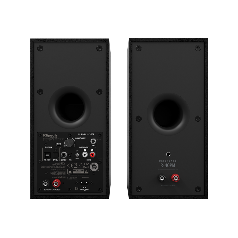 Klipsch R-40PM — модель, представляющая собой активную беспроводную версию пассивных акустических систем Klipsch R-40M, которая оснащена встроенными цифровыми усилителями мощностью в 50 Вт на канал, Bluetooth модулем и обладает широкими коммутационными возможностями. АС получили прочные, акустически инертные корпусы, выполненные в стилистике минимализма. Корпусы изготовлены из MDF и отделаны устойчивой к царапинам виниловой пленкой с текстурой дерева, а для защиты динамиков здесь используется низкопрофильный гриль на магнитном креплении. Толщина панелей составляет 20 мм, что делает его конструкцию жесткой и прочной. Корпус отделан виниловой пленкой под натуральное дерево, устойчивой к механическим повреждениям. Классический дизайн колонок и высокое качество изготовления позволят им хорошо смотреться в домашнем интерьере. Круглый порт фазоинвертора интегрирован в тыльную панель колонки.