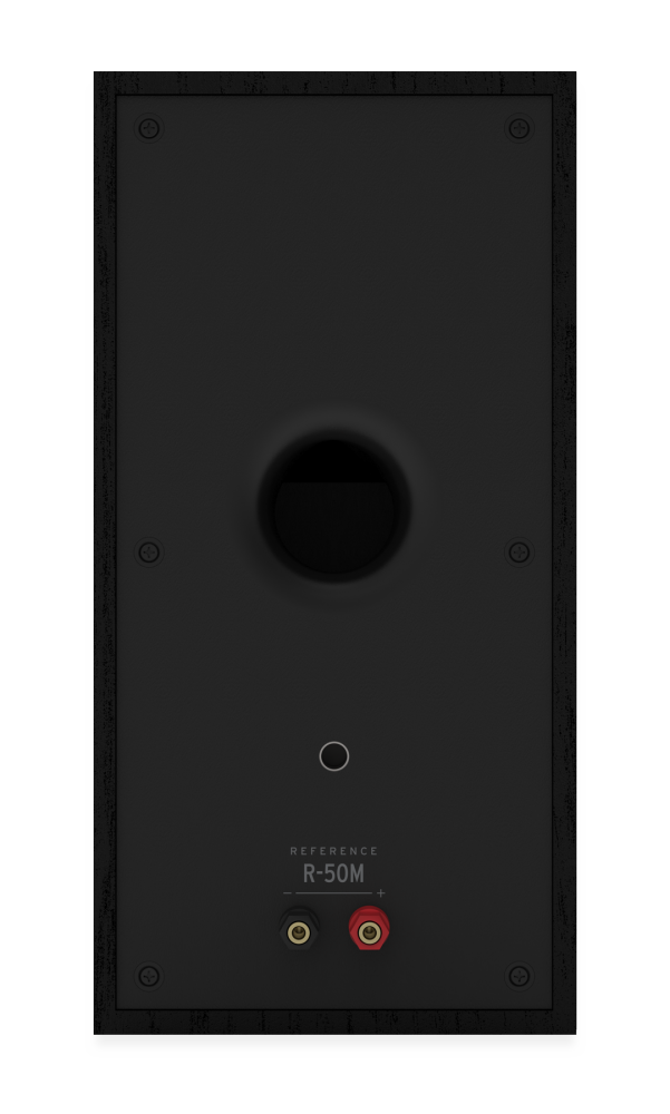 Низкочастотный динамик в Klipsch R-50M имеет диаметр 5,25 дюйма и воспроизводит насыщенные и проработанные басы, которые трудно ожидать от таких небольших колонок. Динамик нагружен на фазоинвертор, выходное отверстие которого выведено на заднюю панель. Там же находится и входной блок, представленный парой винтовых клемм.