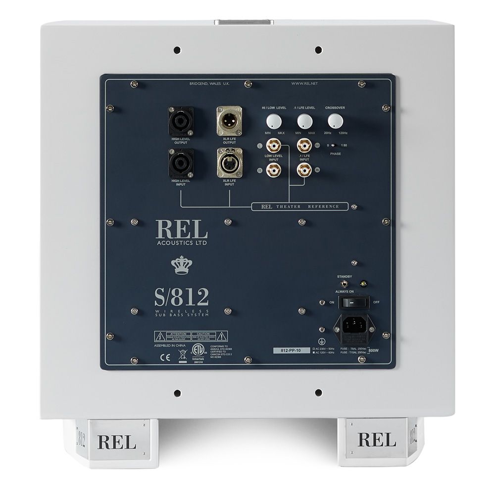 Традиционно для сабвуферов этой компании, REL S812 оснащен как низкоуровневыми, так и акустическими входами. Здесь есть небалансные линейные входы, входы LFE на разъемах RCA и XLR, а акустические входы на разъемах Neutrik Speakon. При этом все входы продублированы транзитными выходами для включения нескольких сабвуферов «по цепочке». Предусмотрена возможность установки нескольких REL S812 друг на друга для создания басовых массивов