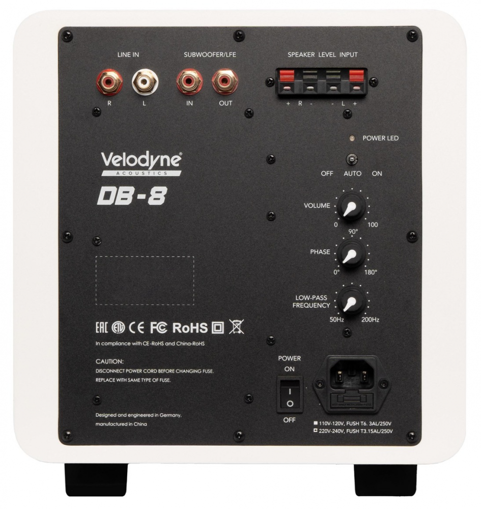 Velodyne Deep Blue 8 – самый компактный сабвуфер компании Velodyne Acoustics с восьмидюймовым НЧ-драйвером с ферритовым магнитом, двойной вентиляцией и усиленной полипропиленовой мембраной. Используется четырехслойная звуковая катушка 2” / 52 мм.