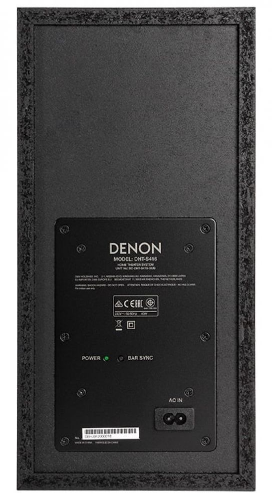 Саундбар имеет конфигурацию 2.1 и комплектуется беспроводным сабвуфером. В основной колонке установлены два 25-мм твитера, а также пара овальных НЧ-динамиков. Использование динамиков такого типа позволило получить насыщенный и напористый звук при сохранении небольшой высоты корпуса колонки. Сабвуфер, которым комплектуется Denon DHT-S416, оснащен басовиком диаметром 165 мм. Высота корпуса саундбара составляет всего 56 мм, поэтому его можно поставить непосредственно перед телевизором, не перекрывая его экран или датчик системы ИК-управления. Однако в комплект поставки Denon DHT-S416 входит и все необходимое для настенного монтажа саундбара.