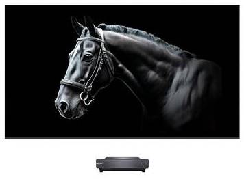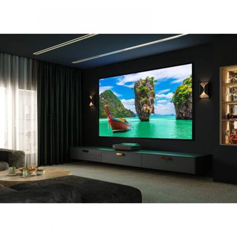 Укомплектованное решение Laser TV 120" TriChroma. В комплекте: 1. Лазерный УКФ-проектор PX1H - DLP-чип 0.47", 4K UHD (16:9) 3840 х 2160; RGB-лазерный модуль прослужит 25000+ часов; палитра DCI-P3 (107% BT.2020); яркость 2400 люмен, контраст 1000:1 (динамический 2000000:1); поддержка HDR10+/HLG и Dolby Vision+Atmos; динамики 2x 15 Вт; русский интерфейс и голосовое управление; каст Anyview; акустика по Bluetooth или S/PDIF; коррекция геометрии проекции, отклик гейм-режим 60 мс, родительский контроль, PVR, защита Kensington и режим отеля; Разъёмы: 2х HDMI2.1+eARC/CEC, HDMI2.0, 2х USB, S/PDIF, 3.5-jack, Ethernet RJ45; WiFi 802.11ac (2.4G/5G); Smart-TV Vidaa U6 (YouTube/RuTube, Ivi,Okko,MeGoGo, 1й канал, TVZavr, Кинопоискб Kion..), габариты (ШГВ) 520 x 324 x 160 мм, вес 9.2 кг 2. Поляризационный ALR-экран 120" с ультра-тонкой рамкой для UST-проекции на основе технологии линз Френеля (поглощает до 90% внешней засветки): размер рабочей области 2657 х 1494 мм, общие габариты 2697 х 1534 х 35 мм. Вес 22.5 кг.