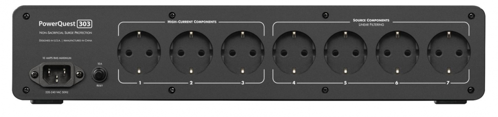 Электрические розетки в AudioQuest PowerQuest 303 разделены на две группы. Одна из них, состоящая из четырех подключений, предназначена для питания устройств с небольшим потребляемым током. Для них предусмотрена фильтрация дифференциальных помех в диапазоне частот 30 кГц – 1 ГГц (подавление более чем на 22 дБ), что обеспечивает более прозрачное и нейтральное звучание техники. Три розетки в AudioQuest PowerQuest 303 рассчитаны на подключение мощного оборудования, в частности усилителей, в том числе многоканальных. Эти аппараты должны мгновенно отдавать в нагрузку значительный импульсный ток, что является необходимым условием широкого динамического диапазона звука. По этой причине подключение розеток для них к электросети сделано в обход фильтров.