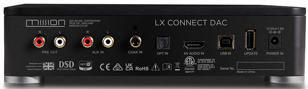 ЦАП Mission LX Connect DAC поддерживает файлы PCM высокого разрешения с частотой до 32 бит/384 кГц через USB и 24 бит / 192 кГц через коаксиальный и оптический входы; DSD (до DSD256) также поддерживается через USB. Имеется фиксированный и регулируемый стерео выход на RCA, питаемый высококачественным аналоговым каскадом.