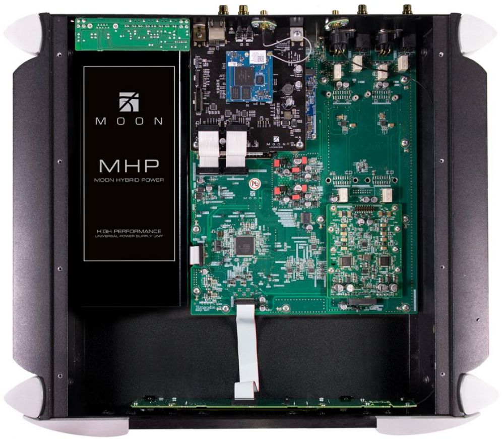 MHP (Moon Hybrid Power) - это универсальный блок питания с высокой мощностью, использующий емкости из проводящего полимера, высокоскоростную цифровую коммутацию и аналоговые линейные регуляторы на последующих этапах (в некоммутируемом режиме), благодаря чему выходной постоянный ток обладает высочайшей стабильностью и исключительно низким шумом. Два этапа схемы стабилизации постоянного тока M-LoVo (MOON Low Voltage); схема на основе новейших технологий, практически свободная от шума, выдающая чрезвычайно быстрое, точное и стабильное напряжение постоянного тока. В результате уровень шума настолько ничтожен, что его практически невозможно измерить. При регулировке напряжения питания применяется фильтрация i²DCf (независимая индуктивная фильтрация постоянного тока); для каждого компонента интегральной схемы на пути сигнала звуковой схемы (DAC, Op-Amp и т.д.) выделен один индуктор; всего 4 этапа. Очень короткий путь прохождения безъемкостного сигнала с системой DC servo, фирменный аналоговый фильтр с крутизной 18 дБ/октава. Полная совместимость с внешним источником питания 820S