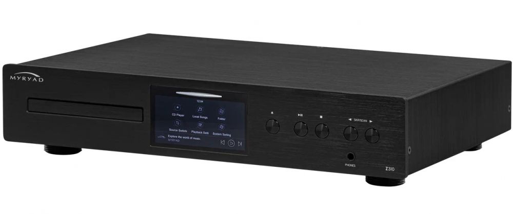 Компания Myryad выпустила современный CD плеер / цифровой медиа плеер Z310. При производстве данной модели использовались аудиофильские комплектующие: чип ЦАП — ESS ES9219C, чипы Bluetooth 5.0, конденсаторы NICHICON, аудиотранзисторы Sanken. Плеер имеет высококачественный аналоговый XLR выход и классический RCA. Так же Z310 обеспечен всеми необходимыми цифровыми выходами – оптическим и коаксиальным, а для желающих воспроизводить свой контент через USB – можно использовать встроенный ЦАП с замечательными характеристиками 32бит/768кГц и DSD512 – USB type B или USB type A – для подключения флеш – накопителя. На борту проигрывателя имеется современный Bluetooth 5.0 для передачи HiRes Audio без потерь. Плеер оборудован большим цветным сенсорным экраном. Для владельцев наушников в Z310 имеется выход 6,35 мм.