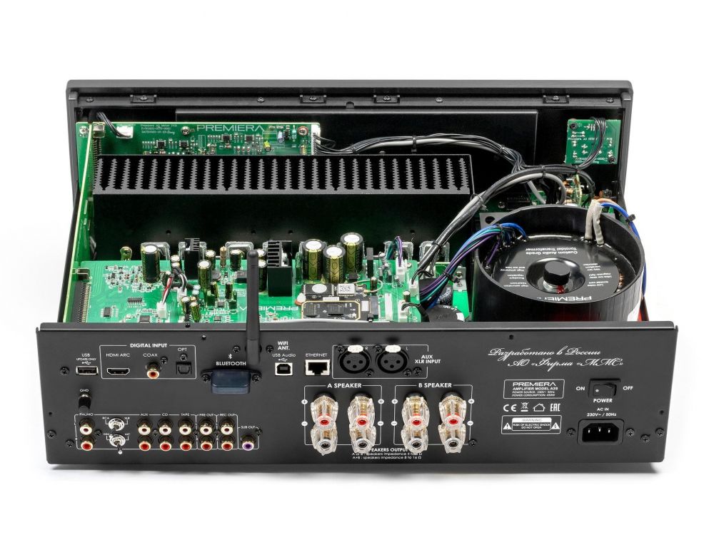 За главную функцию усилителя Premiera A3S отвечает его усилительная часть, питание которой обеспечивает тороидальный экранированный трансформатор мощностью 450 Ватт.