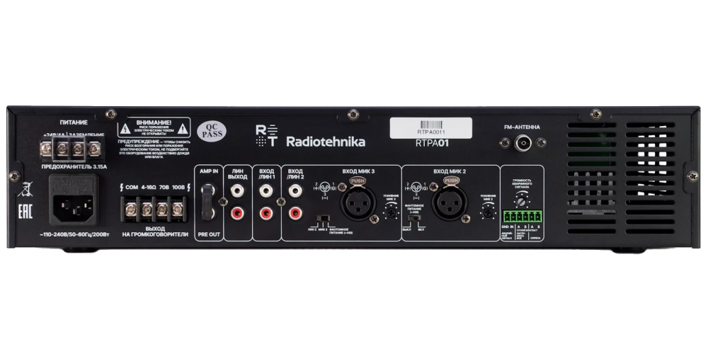 Radiotehnika RTPA01 представляет собой одноканальный микшер-усилитель, предназначенный для использования в составе инсталлированных систем озвучивания различных объектов. Это могут быть учебные заведения, гостиницы, торговые или бизнес-центры, а также различные места общественного питания, такие как кафе, рестораны и бары. Модель объединяет в одном корпусе стандартного форм-фактора 4-канальный микшер для нескольких источников сигнала, медиаплеер и мощный усилитель, который позволит справиться с озвучиванием больших помещений. Устройство позволяет сэкономить затраты на дополнительное оборудование, а также свободное место в пространстве, необходимое для установки.