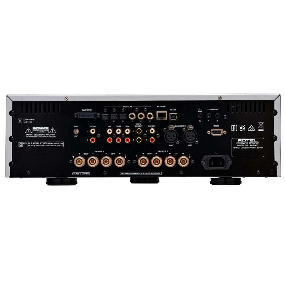 Rotel RA-6000 поддерживает MQA и MQA Studio. Беспроводная связь aptX HD и AAC Bluetooth. Первоклассный цифро-аналоговый преобразователь Texas Instruments 32 бит/384 кГц. Цифровые входы поддерживают аудиопотоки 24 бит/192 кГц. Асинхронный вход ПК/USB поддерживает звук до 32 бит/384 кГц, декодирует и воспроизводит MQA и полностью сертифицирован Roon Tested. Для любителей винила также предусмотрена ММ-фонокорректор, поддерживает катушки с подвижным магнитом. Элементы управления на передней панели, ИК-пульт дистанционного управления с подсветкой и двухстрочный дисплей обеспечивают интуитивно понятное управление. На борту вы найдете вход Ethernet, вход/выход триггера RS232, 12 В и внешний удаленный вход, которые упрощают интеграцию с системами управления. Доступно подключение двух сабвуферов через соответствующие RCA-разъемы. Имеется набор цифровых S/PDIF-входов (по три коаксиальных и оптических), асинхронный USB-порт и Ethernet-интерфейс для подключения к локальной сети, что дает возможность управлять усилителем через браузер. Есть интерфейс RS-232, ИК-порт и пара триггерных выходов. Для подсоединения АС служат четыре пары винтовых клемм, с помощью которых можно легко обеспечить двухпроводное подключение. На фронтальной панели корпуса находится 3,5 мм гнездо для наушников и USB-порт, предназначенный для подключения устройств Apple.