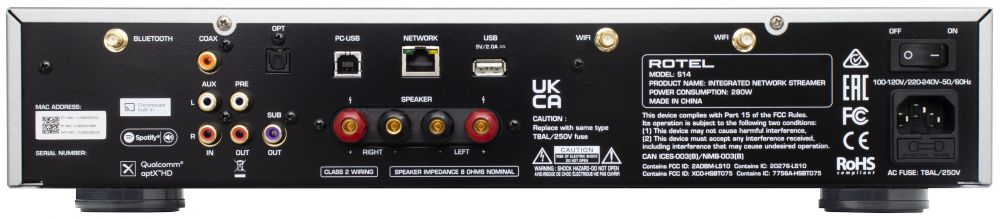 S14 оснащен коаксиальным, оптическим цифровым и аналоговым входами, а также Bluetooth aptXTM HD и портом PC-USB, что обеспечивает подключение ко всем источникам звука, и поддерживает воспроизведение файлов MP3, WMA и AAC с флэш-накопителей.