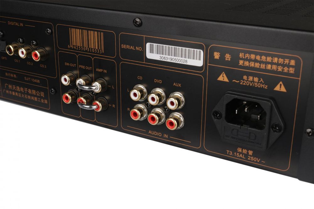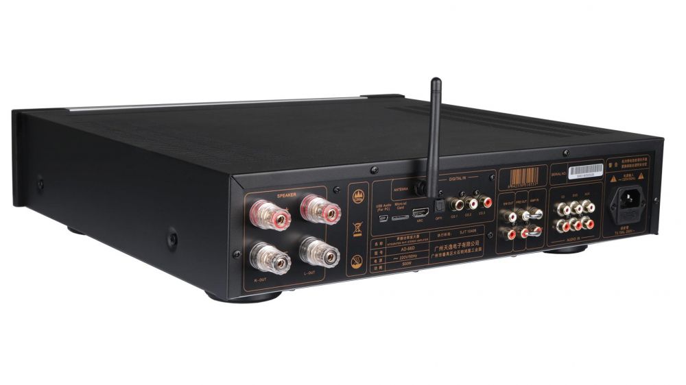 - Усилитель оснащен развитым функционалом. Цифровые входы: 3 коаксиальных входа и 1 оптический (оба поддерживают до 24 бит/192 КГц), 3 аналоговых входа. Также имеется вход усилителя мощности и HDMI ARC вход.