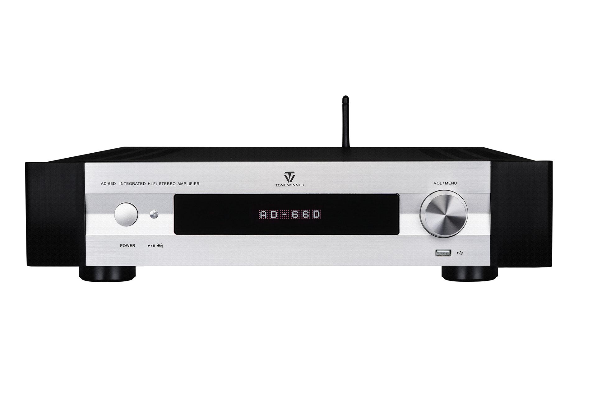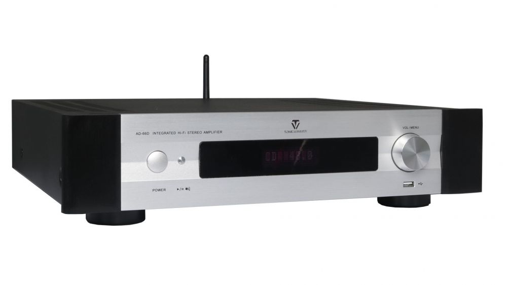 Усилитель TONE WINNER AD-66D сделан на базе профессиональной версии AD-66PRO с добавлением высококачественного аудио декодера и аудио модуля Bluetooth. В качестве ЦАПа используется аудиофильский топовый чип американской компании Analog Devices AD-1955, который имеет более высокие оценки качества, чем AD-1853, и частоту дискретизации 192 кГц при разрядности в 24 бит. ЦАП оснащен отдельной цифровой фильтрацией и цифро-аналоговой коммутацией входных и выходных сигналов, а его динамический диапазон и соотношение сигнал/шум может достигать 126 дБ, что позволяет максимально снизить степень ошибки цифрового потока данных при синхронизации. Даже обычный CD сигнал, декодированный с помощью этого ЦАПа, преобразуется в чарующее звучание. Обладая такими характеристиками, как низкий уровень искажений и шума, высоким разрешением, он имеет регулировку тембра, а его дифференциальный выход подключается к регулятору громкости с шагом 0,5 дБ с применением микросхемы Japan Radio Company NJW1194 для управления входом источника звука. Цифровое ядро этой микросхемы выполняет фильтрацию, регулировку громкости и контроль уровня входного сигнала. Большой объем в блоке питания усилителя мощности занимают конденсаторы емкостью 12000 мкФ, специально изготовленные для TONE WINNER, а выходной каскад оснащен высокоскоростными транзисторами Toshiba (150 Вт). Эксплуатационная надежность схемы с низким значением КНИ и высокой скоростью нарастания и впечатляющая конструкция, вмещающая новейшие технологии производства, имеют критически важную значимость в точности передачи всех параметров исходного материала, поэтому усилитель AD-66D обладает выдающимися музыкальными возможностями.